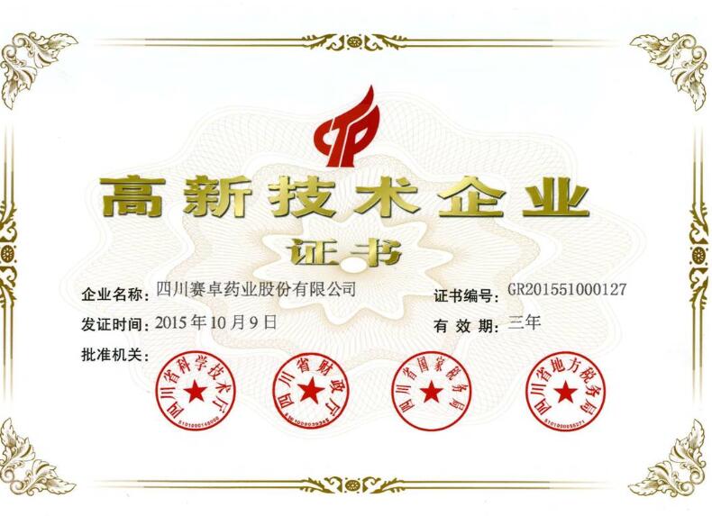 我公司近日收到由四川省科技厅、四川省财政厅、四川省国家税务局、四川省地方税务局联合签发的《高新技术企业证书》,证书编号: GR201551000127,证书签发时间为 2015年10月 9日,有效期为三年。